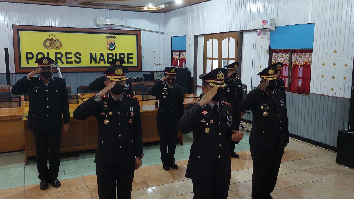 Turut mendampingi, Waka Polres Nabire Kompol Ramadhona, S.H., S.I.K beserta para pejabat utama Polres yang terlihat mengenakan baju PDU 1 saat mengikuti upacara secara virtual.
