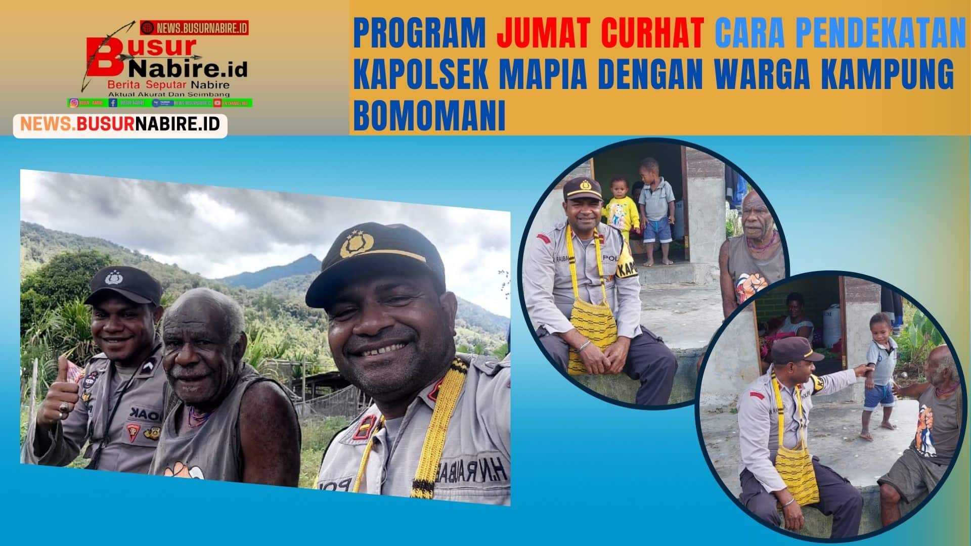 NEWS.BUSURNABIRE.ID _ Bomomani – Program Jum’at Curhat yang dilakukan Polsek Mapia dengan cara memberikan rasa aman kepada seluruh lapisan masyarakat Kapolsek Mapia Ipda Hans Nataniel Raubaba S.E Bersama Personil Polsek Mapia sambangi Warga Masyarakat Kampung Bomomani ” Jumat 24/02/2023