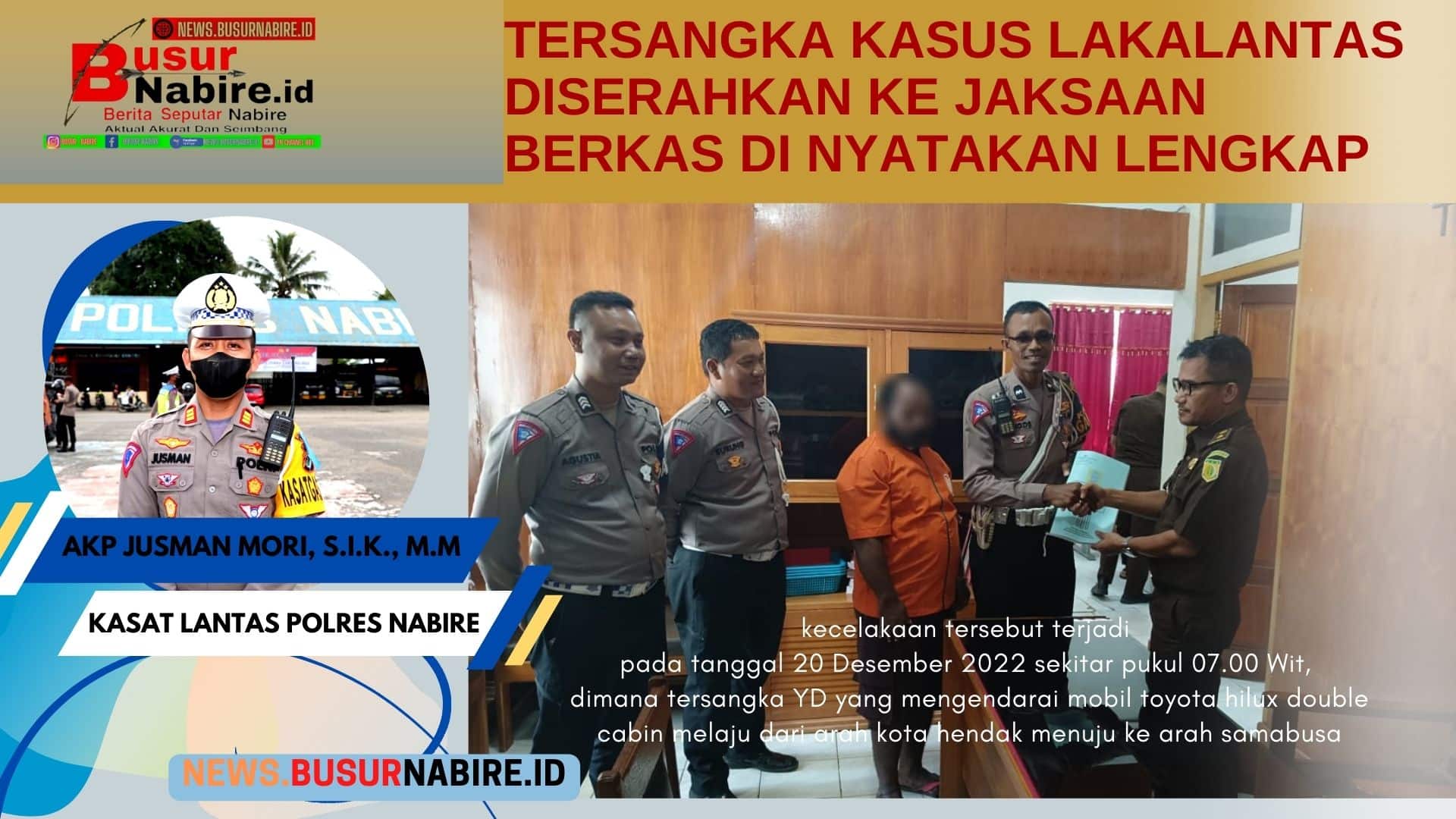 Kasat Lantas Polres Nabire AKP Jusman Mori, S.I.K., M.M saat dikonfirmasi mengatakan bahwa YD diproses hukum berdasarkan laporan polisi nomor : LP/A/98/XII/2022/SPKT.LANTAS/Res Nabire/Polda Papua tanggal 20 Desember 2022.