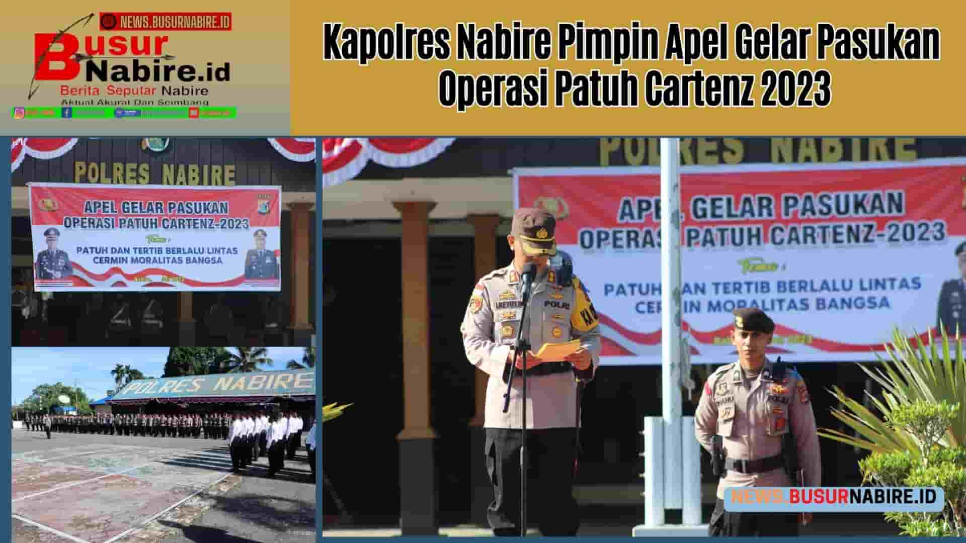 Apel gelar pasukan Ops Patuh Cartenz 2023, sebagai Pimpinan Apel Kapolres Nabire AKBP I Ketut Suarnaya, S.I.K., S.H, perwira apel AKP Mattinetta, S.Sos. MM, Komandan apel Ipda Etwin R. Mangallo, S.H, dan dihadiri Para PJU Polres Nabire, Sub Den POM serta para personel Polres Nabire.