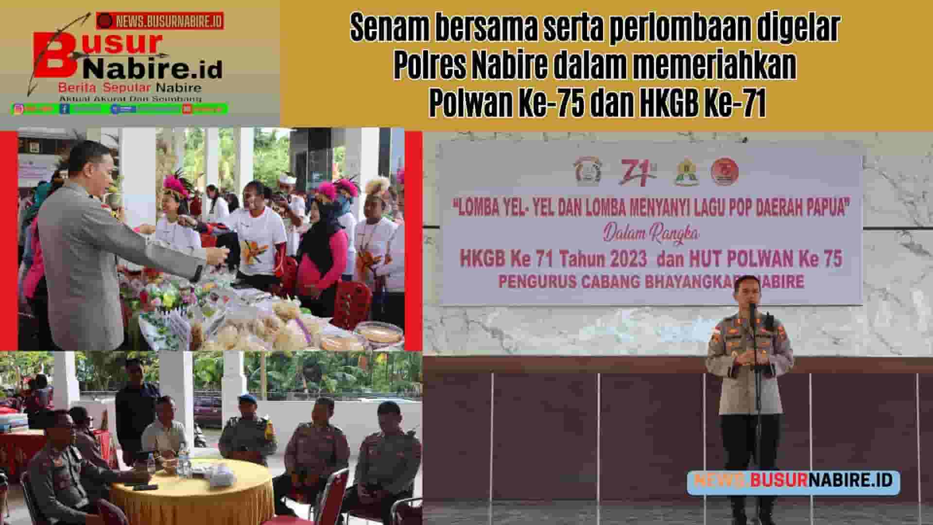 NEWS.BUSURNABIRE.ID – Nabire – Dalam rangka meriahkan HUT Polwan Ke-75 dan HKGB Ke-71 Tahun 2023. bertempat di Halaman Aula Wicaksana Laghawa Polres Nabire, dilakukan olahraga bersama dan lomba UMKM, Yel-yel serta lomban menyanyi, Kamis (31/8/23).