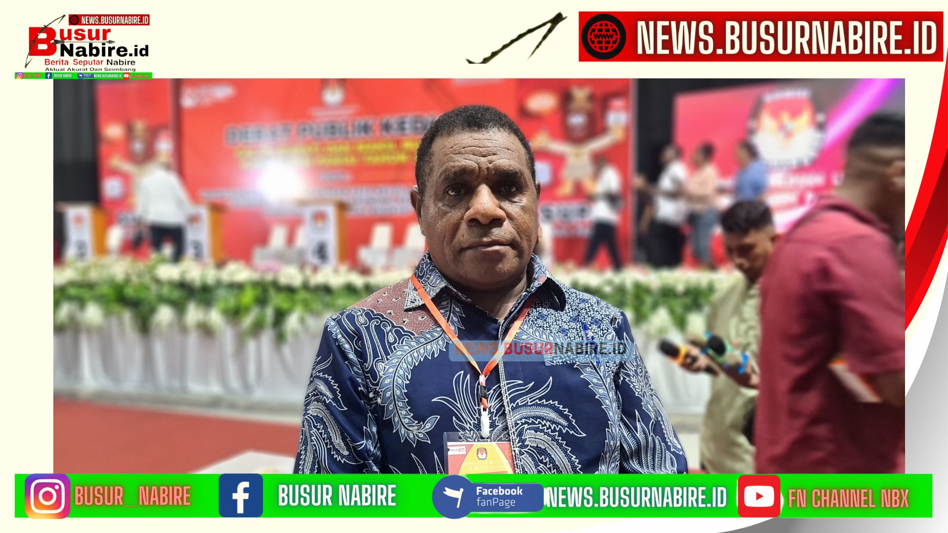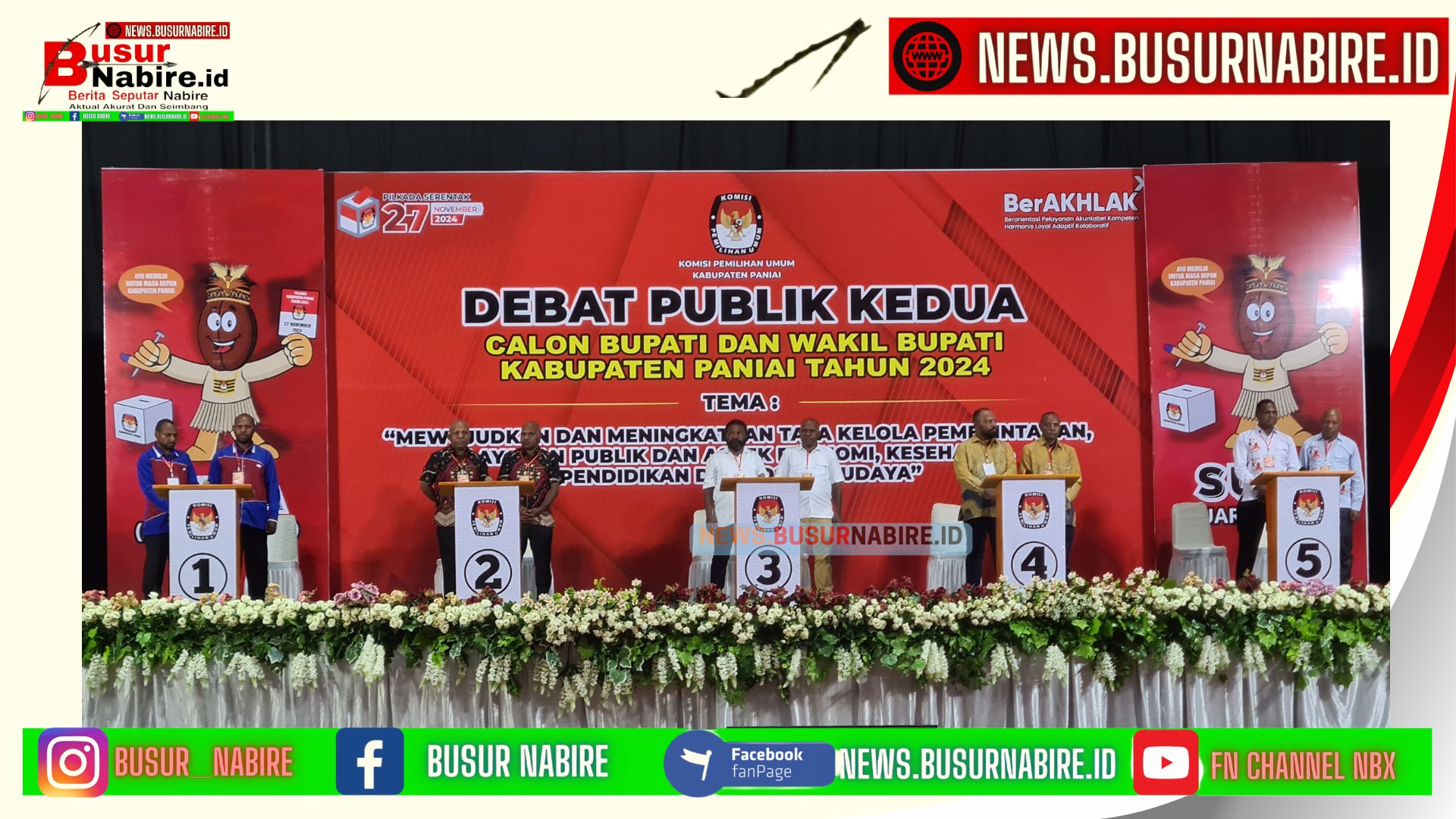 NEWS.BUSUR NABIRE.ID – NABIRE: Debat publik kedua calon Bupati dan Wakil Bupati Kabupaten Paniai berlangsung di Aula KSK Bukit Meriam, Jalan Sudirman, pada Rabu, 30 Oktober 2024. Acara ini diselenggarakan oleh KPU Kabupaten Paniai dan dihadiri oleh Badan Pengawas Pemilu (Bawaslu), serta panelis dan pihak terkait lainnya.