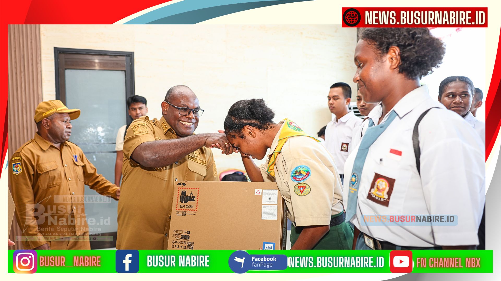 NEWS.BUSURNABIRE.ID – Nabire | Suasana haru menyelimuti Kantor Gubernur Papua Tengah Nabire, Selasa (2/9/2025). Gubernur Papua Tengah, Meki Nawipa, dengan penuh kehangatan menyerahkan hadiah 40 unit laptop kepada para anggota Pasukan Pengibar Bendera (Paskibra) perwakilan dari delapan kabupaten di Papua Tengah.