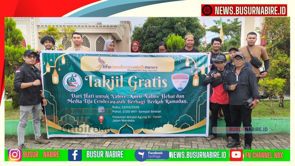 NEWS.BUSURNABIRE.ID – Nabire | Papua Tengah | Semangat berbagi di bulan suci Ramadhan kembali terlihat di Kabupaten Nabire. Media Tifa Cenderawasih News (TCN) bersama komunitas Kurir Nabire Hebat (KNH) menggelar aksi sosial berbagi takjil kepada masyarakat yang melintas di Jalan Merdeka, tepat di depan Masjid Agung Al Falah Nabire, Rabu (11/3/2026) sekitar pukul 17.00 WIT.