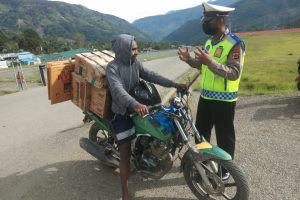 Sat Lantas Polres Tolikara Terus Gencar Ingatkan Pengendara Pentingnya Penggunaan Helm dan Masker